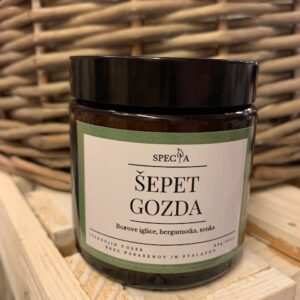 Ročno izdelana sveča iz sojinega voska, kateremu je dodano dišavno olje “Šepet gozda”. Sveča bo vaš prostor odišavila s prijetno noto borovih iglic, bergamotke in tonke. Posodica vsebuje približno 90g./120 ml, soja voska, kar omogoča čas gorenja vse do 20 ur.